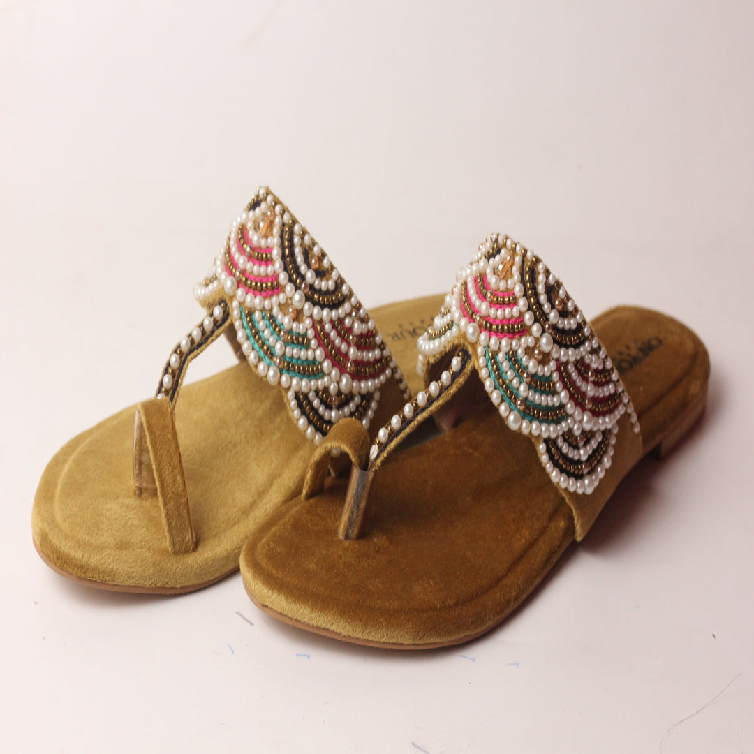 Additional Description: Put on these gold kolhapuri shoes to stand out from the crowd. These are ideal for music festivals, with their kantha stitches and silver accents patterned like jewels.