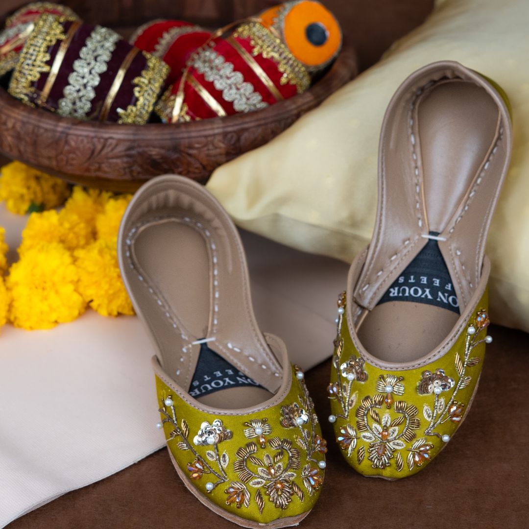 Bring nature’s richness to your feet with Olive Bloom, a handcrafted jutti that channels the beauty of blooming florals in a regal olive green tone. Adorned with delicate zari leaves, sequins, pearls, and golden accents, this pair is a blend of earthy elegance and traditional charm.