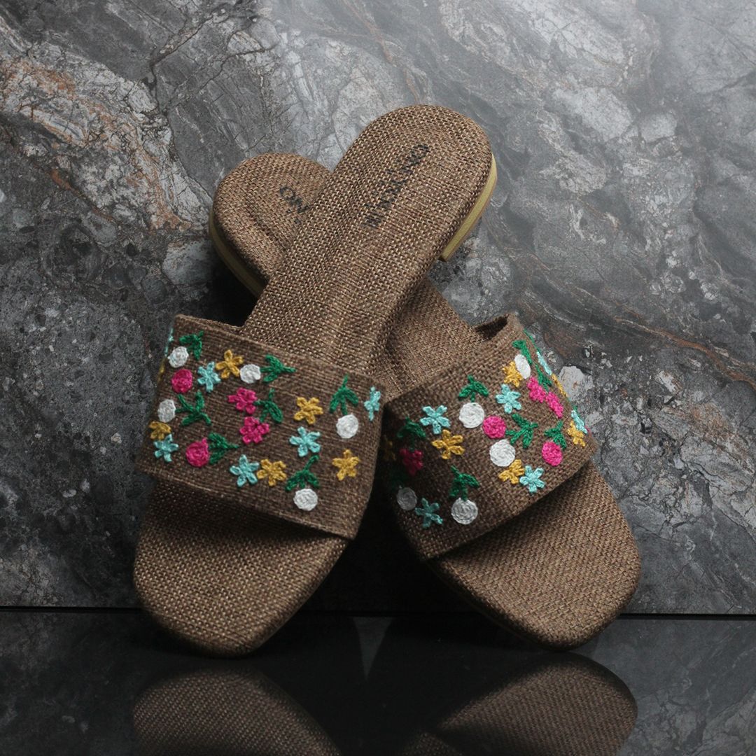 Upper-Â Knitted Jute Fabric with Hand Embroidery